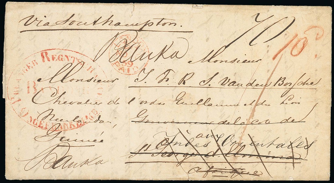 1857 (2 Aug.) entire letter from Bandong Java, addressed to "Gouveneur de la Cote de Guinee a St George d'Elmina, Afrique", "70" and "10d" accountancy marks, showing "batavia" c.d.s. in red (9.9) and indistinct Singapore c.d.s., re-addressed to "Banka, aux Indies Orientales" with "london/ paid" c.d.s. (6.11), eventually received at Muntok, Banka on 19.2.61, An extraordinary re-directed cover to a most unusual destination. Photo