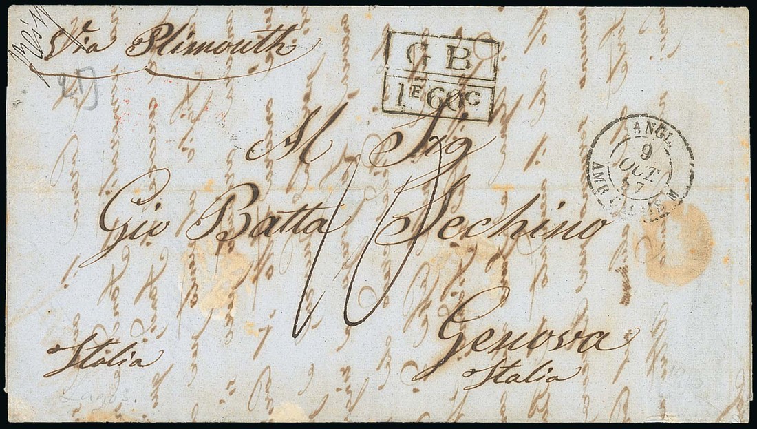 1857 (5 Sept.) entire letter ex the "Secchino" correspondence to Genoa, marked "Via Plimouth" (sic), rated "10" showing framed "gb/1f.60c" (Fig. 3040), Calais entry datestamp (9.10) and, on reverse, "plymouth/packet letter" c.d.s., London (9.10) and Paris (10.10) transit c.d.s. and arrival d.s. (12.10). Photo