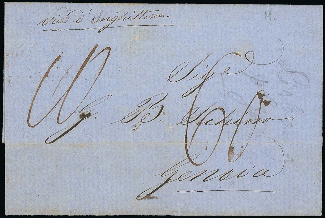 1859 (31 Aug.) entire letter ex the "Secchino" correspondence to Genoa, marked "via d'Ingliterra", rated "10" and "60" and showing, on reverse, boxed "liverpool/ship" (31.10) and arrival (6.11) datestamps. Photo