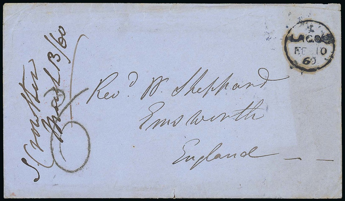 1860 (10 Feb.) envelope (with original letter from Samuel Crowther, a freed slave and later Bishop on the Niger) to London, showing slightly over-inked "b/lagos" c.d.s. (earliest recorded date), handstruck "d6" and, on reverse, "liverpool/br. packet" (12.3) and arrival (13.3) datestamps. Photo