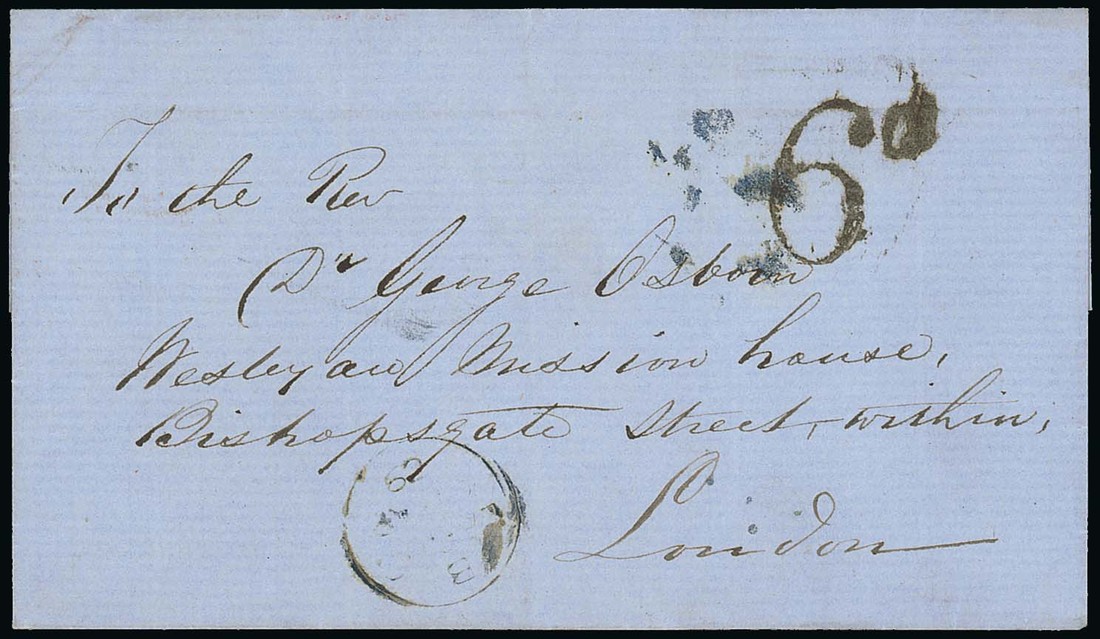 1862 (Apr.) missionary entire to London, showing poor "b/lagos" c.d.s. with year inverted, handstruck "6d" and, on reverse, red arrival datestamp (12.5). Photo