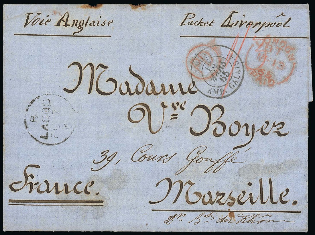 1865 (7 Feb) entire letter to Marseilles, marked "Packet Liverpool", showing red crayon "1/3d", legible "b/lagos" c.d.s., circular-framed "pd" and London Paid transit d.s. (13.3) in red, Calais entry d.s. with arrival c.d.s. (14.3) on reverse. Photo
