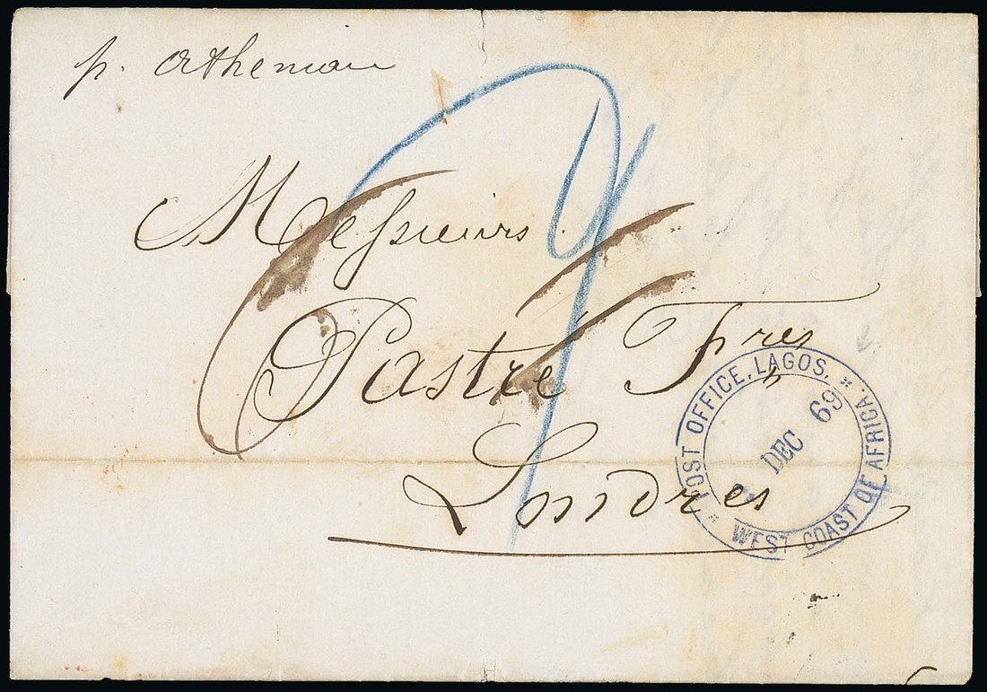 1869 (12 Dec.) entire letter to London, marked "p. Athenian", showing blue crayon "d1", manuscript "6" and very fine "post office, lagos/west coast of africa" double-ring d.s. in blue (crossed by horizontal filing crease) and, on reverse, red arrival c.d.s. (15.1). Photo