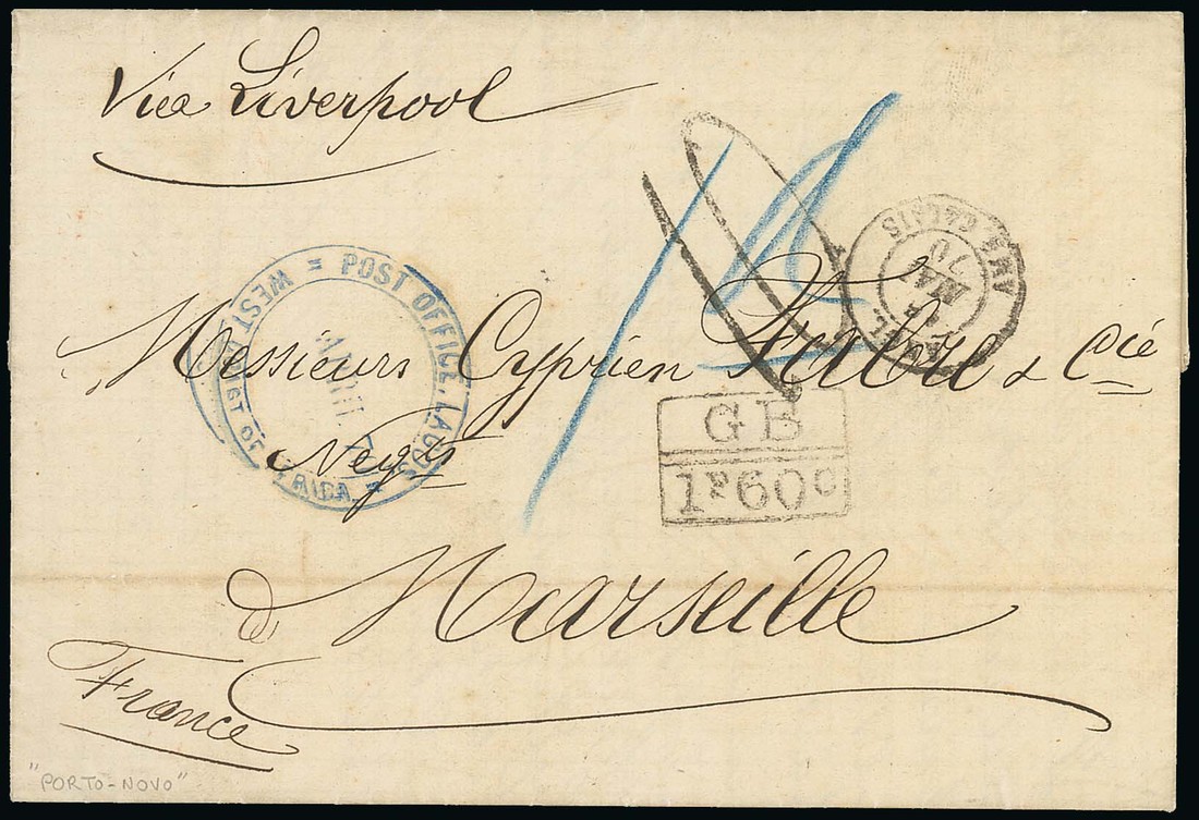 1870 (12 Apr.) entire letter from Porto Novo, Dahomey to Marseilles, marked "Via Liverpool", showing mainly fine strike of "post office, lagos/west coast of africa" double-ring d.s. in blue, blue crayon "1d", "gb/1f 60c" accountancy h.s. (Fig. 3040), handstruck "10" (decimes), Calais entry d.s. (16.5) with, on reverse, London (16.5) and arrival (17.5) datestamps. Photo