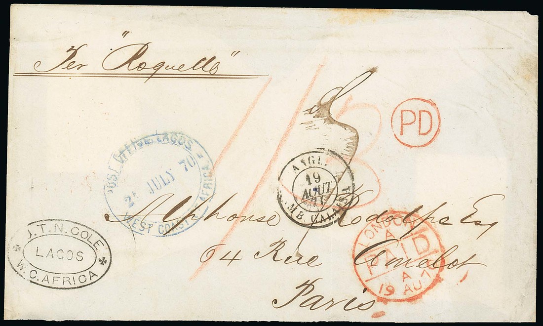 1870 (21 July) envelope to Paris, marked "Per Roquelle", showing red crayon "1/3" and manuscript "5", good to fine strike of "post office, lagos/west coast of africa" double-ring d.s. in blue, circular-framed "pd" and London Paid transit d.s. (19.8) in red, and Calais entry d.s. (19.8). Photo