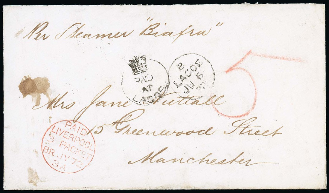 1872 (6 June) envelope ex the "Nuttall" correspondence to Manchester, marked "Per Steamer Biafra", showing fine "paid/at/lagos" Crowned circle with "b/lagos" c.d.s. alongside, red crayon "5", "paid/liverpool/3 packet/br. jy 72/3a" c.d.s. in red with arrival datestamp on reverse. Photo