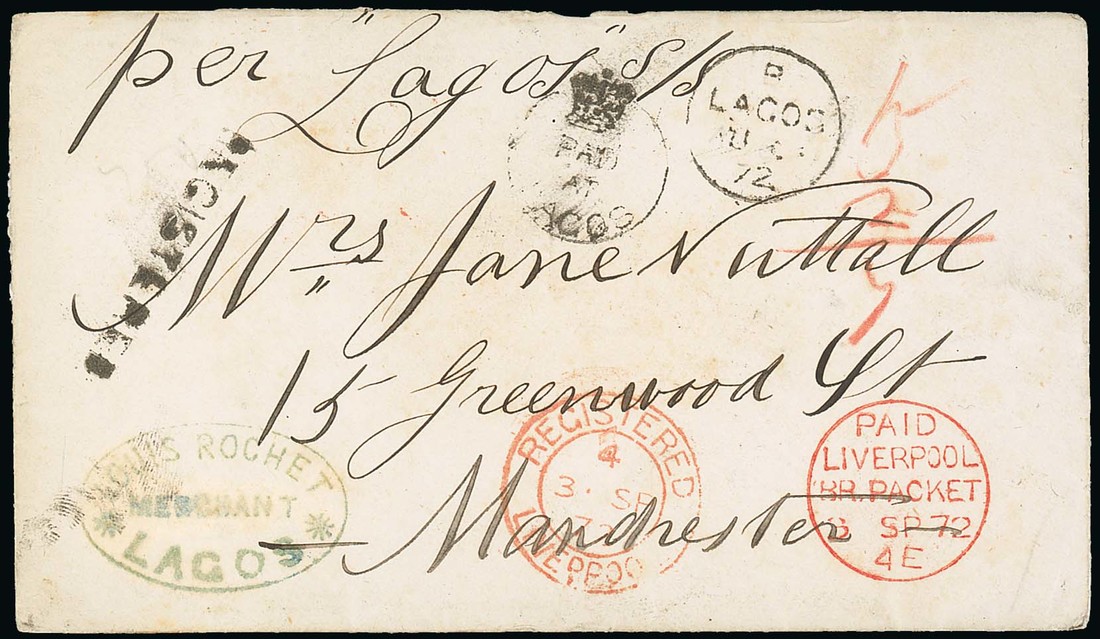 1872 (6 Aug.) envelope ex the "Nuttall" correspondence to Manchester, marked "per Lagos S/S", showing mainly fine "paid/at/lagos" Crowned circle with "b/lagos" c.d.s. alongside, red crayon "5" over "2/7", straight-line "registered" h.s., "paid/liverpool/br. packet/4e" c.d.s. (3.9) and "registered/liverpool" double-ring d.s., both in red, and arrival datestamp on reverse. Neat and attractive. Photo