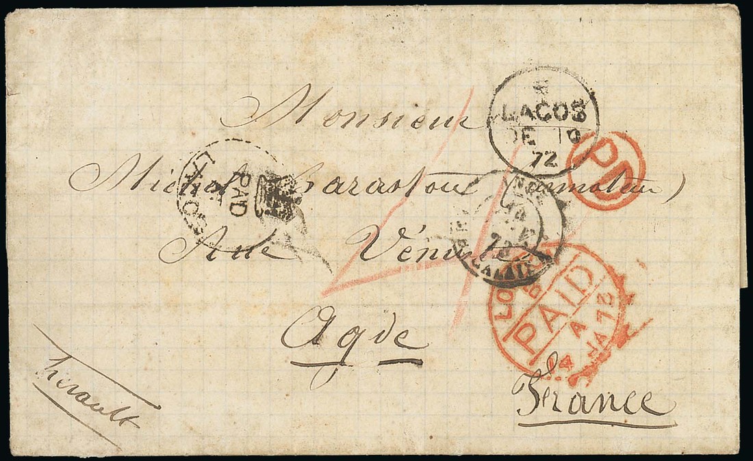 1872 (10 Dec.) entire letter headlined "Leki" to France, showing fine "paid/at/lagos" Crowned circle (over four months later than recorded by Parmenter), red crayon "4", "b/lagos" c.d.s. (over four months later than recorded by Sacher), circular-framed "pd" and London Paid transit c.d.s. (14.1) in red, Calais entry datestamp with various French T.P.O. and arrival datestamps on reverse. Photo