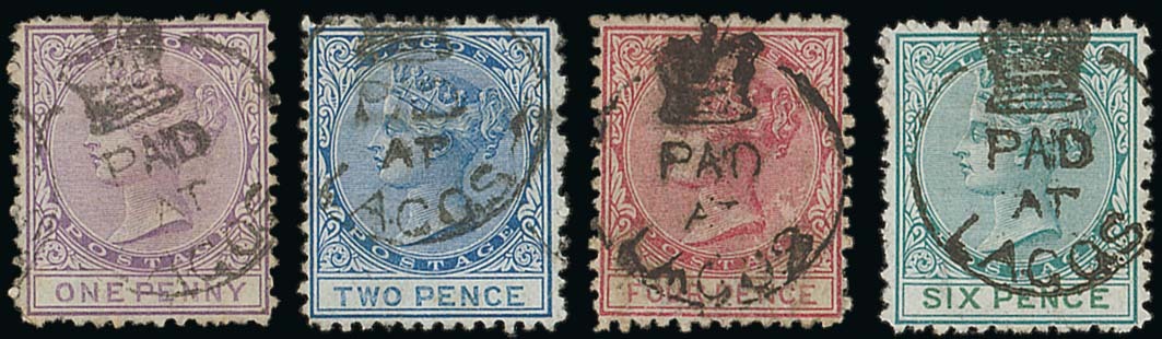 1874-75 perf 12½ 1d. lilac-mauve (perf faults), 2d. blue, 4d. carmine and 6d. blue-green, each cancelled by centrally struck, good to fine, almost complete strikes of "paid/at/lagos" Crowned circle in black, fine. Rare. R.P.S. Certificate (1973) for 1d. Photo