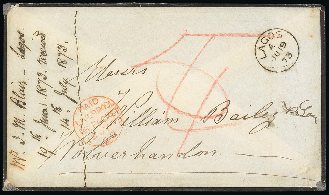 1873 (19 June) mourning envelope ex the "Bailey" correspondence to Wolverhampton, showing very fine "lagos/a" c.d.s. in black , red crayon "4" changed to "5", "paid/liverpool/br. packet/2b" c.d.s. (12.7) in red with arrival datestamp (13.7) on reverse. Photo