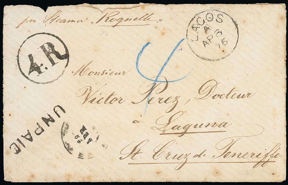 1876 (6 Apr.) envelope to Tenerife, marked "per Steamer Roquelle", showing fine "lagos/a" c.d.s. in black, blue crayon "4", straight-line "unpaid", "4.r" in circle with arrival datestamp (28.4) on reverse; the envelope with some minor fox spots and a little creased at lower left. Photo