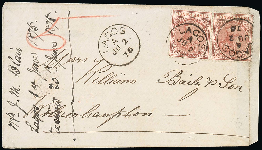 1875 (2 June) envelope ex the "Bailey" correspondence to Wolverhampton, bearing 3d. red-brown (2, one creased at side through being placed over edge of cover) tied by "lagos/a" c.d.s., showing red crayon "5" with arrival datestamp (30.6) on reverse. Photo