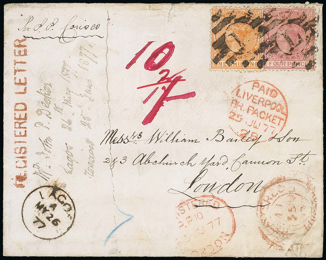 1877 (26 May) double rate envelope ex the "Bailey" correspondence to London, marked "Per S.S. Corisco", bearing 4d. carmine and 1/- orange (value 16½mm.) cancelled by "L" in diamond of bars, showing red ink "10" over "2/1/-", "lagos/a" c.d.s. with straight-line "registered-letter" h.s., "paid/liverpool/br. packet/2b" (25.6), "registered/liverpool" double-ring and arrival datestamps, all in red. Photo
