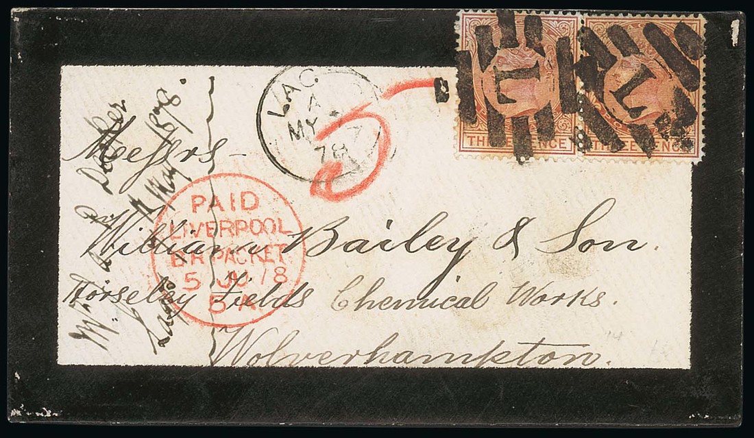 1878 (7 May) mourning envelope ex the "Bailey" correspondence to Wolverhampton, bearing 3d. chestnut pair with both heavily cancelled by "L" in diamond of bars, showing red crayon "5", "lagos/a" c.d.s. and red "paid/liverpool/br. packet/5a" c.d.s. (5.6) with arrival datestamp on reverse. Photo