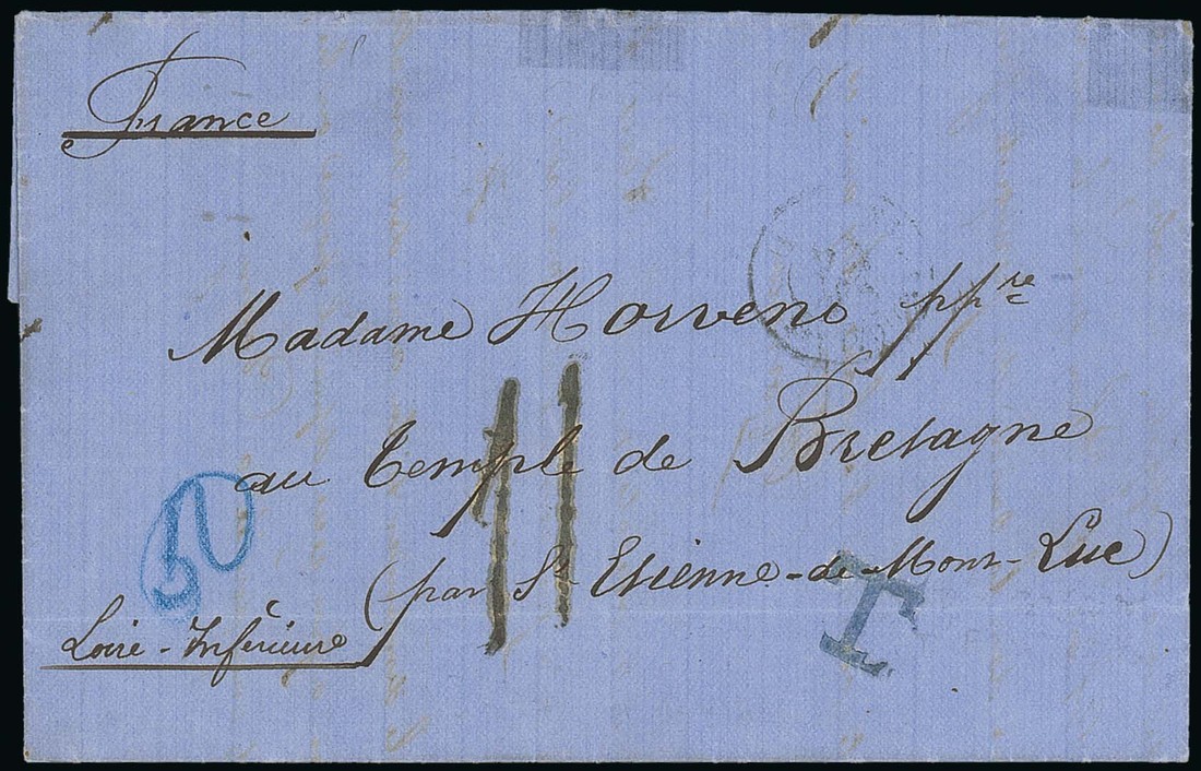 1876 (12 July) entire letter from Opobo to France, showing "t" h.s., blue crayon "50", manuscript "11" and, on reverse, London (4.9) and St. Etienne arrival (5.9) datestamps. Photo