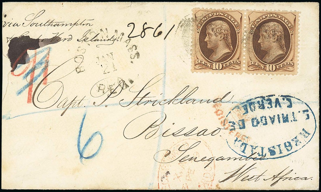 1879 (21 Jan.) envelope registered from Boston USA to Bissao, marked "via Southampton & Cape Verde Islands", bearing lightly cancelled 1873 10c. deep brown pair and showing "boston mass./reg." c.d.s., red crayon "91" (deleted) and blue crayon "6", "Crown/registered" h.s. and London transit d.s. (2.2) in red, and oval-framed "registrada/s. thiago de/c. verde" h.s. in blue. A rare and attractive item of incoming mail. Photo