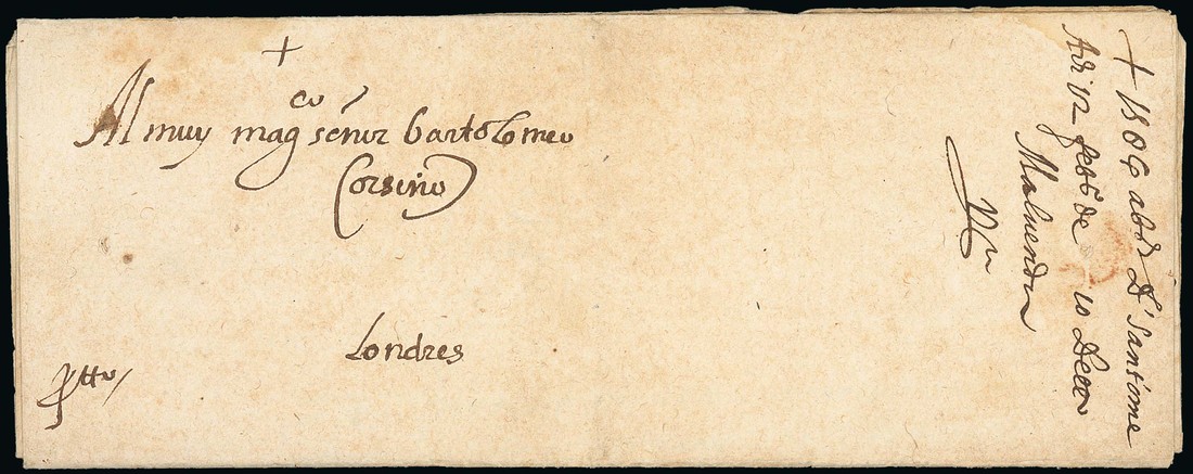 1585 entire letter to Bartolomeo Corsini in London from Francisco and Pedro Maluenda in São Tome regarding the opening of an office and terms of trade 'in this place', also another letter of 5 April 1590 from Hamburg to Bartolomeo Corsini in London which refers to São Tome. Photo