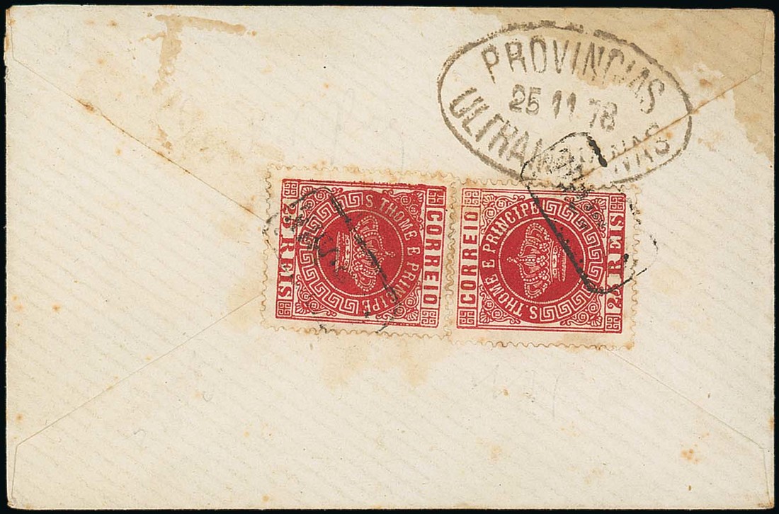 1878 (25 Nov.) envelope to Lisbon bearing, on reverse, 1878 25r. red (2) tied by framed "s.thomé" and showing oval-framed "provincias/ultramarinas" d.s. alongside; both 25r. with light staining. Rare. Photo