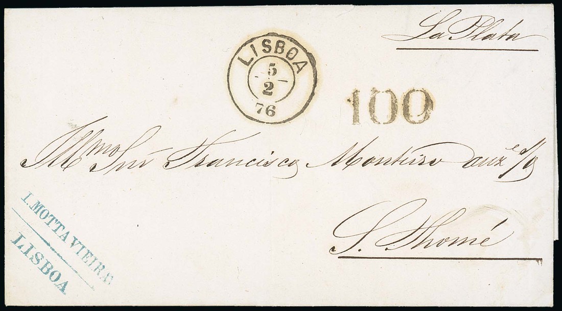 1876 (5 Feb.) entire letter from Lisbon to Saô Tome, marked "La Plata" (French Compagnie de Messagiers), showing despatch c.d.s. and handstruck "100" (reis). Photo
