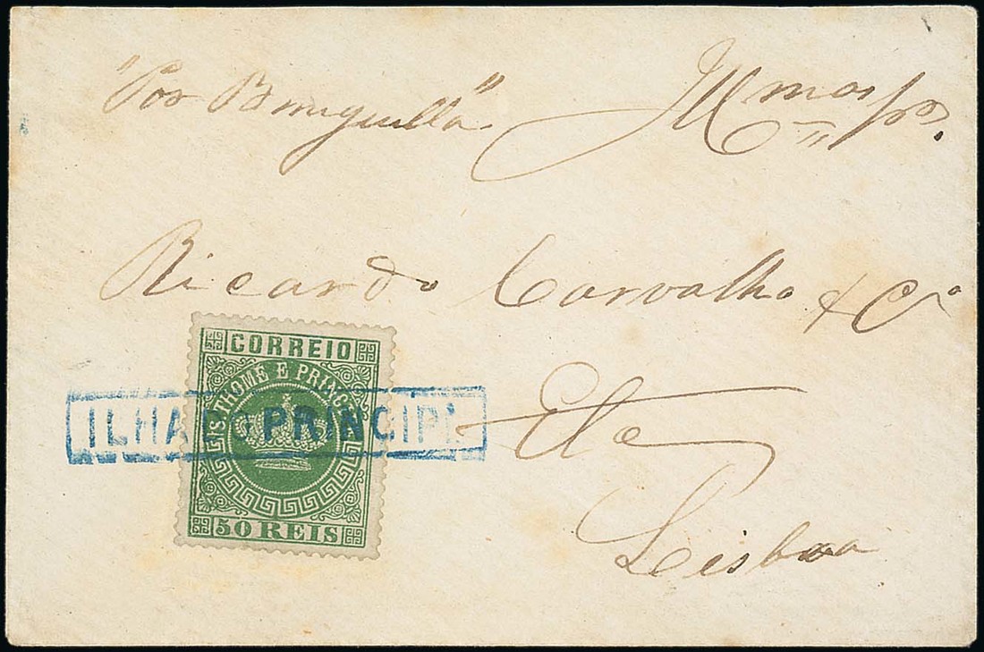 1876 envelope to Lisbon, bearing 1875-77 50r. deep green clearly tied by framed "ilha do principe" in blue and showing, on reverse, oval-framed "provincias/ultramarinas" d.s. (5.1.77). Very rare. Photo