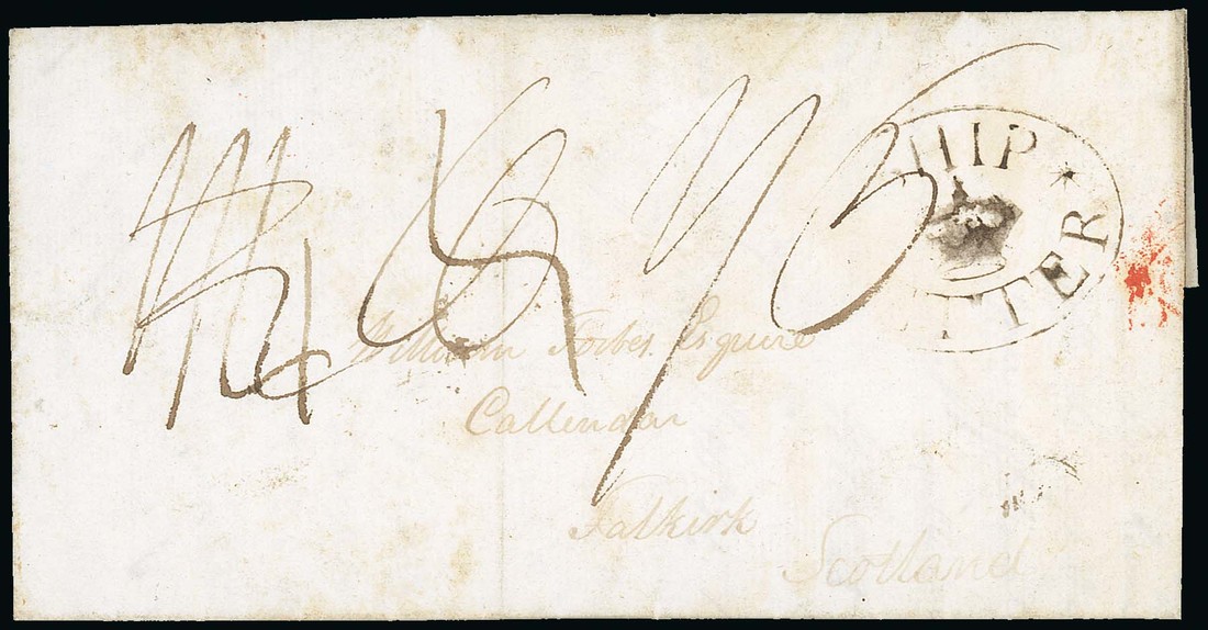 1804 (31 Dec.) entire letter ex the "Forbes" correspondence, from Gorée to Falkirk, rated "4" (deleted), "1/4" (deleted) and "1/5", showing "ship/Crown/letter" oval h.s. of London (Type S.10) and, on reverse, red London datestamp (27.2). The contents concern William Forbes' appointment as Asst. Surgeon at 7/6d. a day. Rare British Occupation mail. Photo