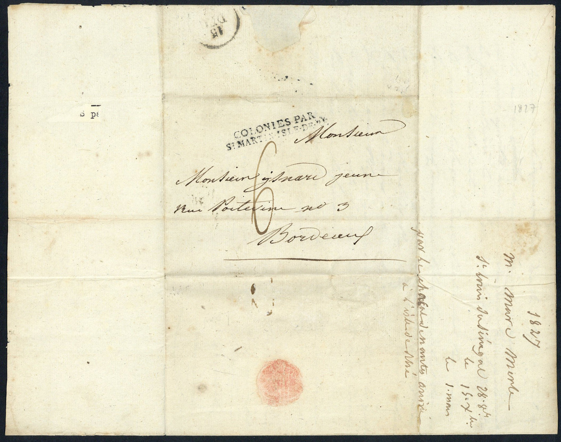 1827 (28 Oct.) entire letter from St. Louis to Bordeaux, charged "6" (decimes) and showing "colonies par/st martin isle de re" h.s. with arrival c.d.s. (15.12) on reverse