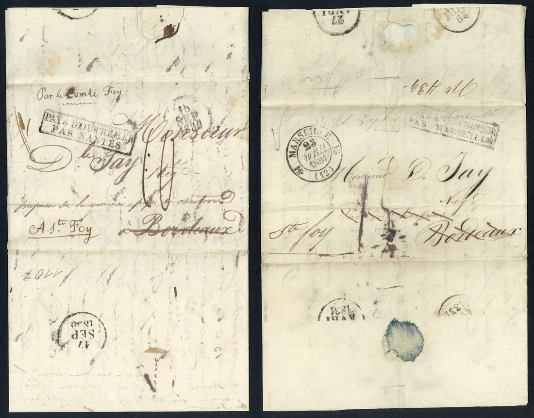 1830 (20 July) entire letter from St. Loius to Bordeaux, showing framed "pays d'outremer/par nantes", and 1831 (13 Mar.) entire letter (with disinfection slits) ex the same correspondence from Gorée to Bordeaux, showing framed "pays d'outremer/par marseille", charged "10" and "15" (decimes) respectively, both have been forwarded