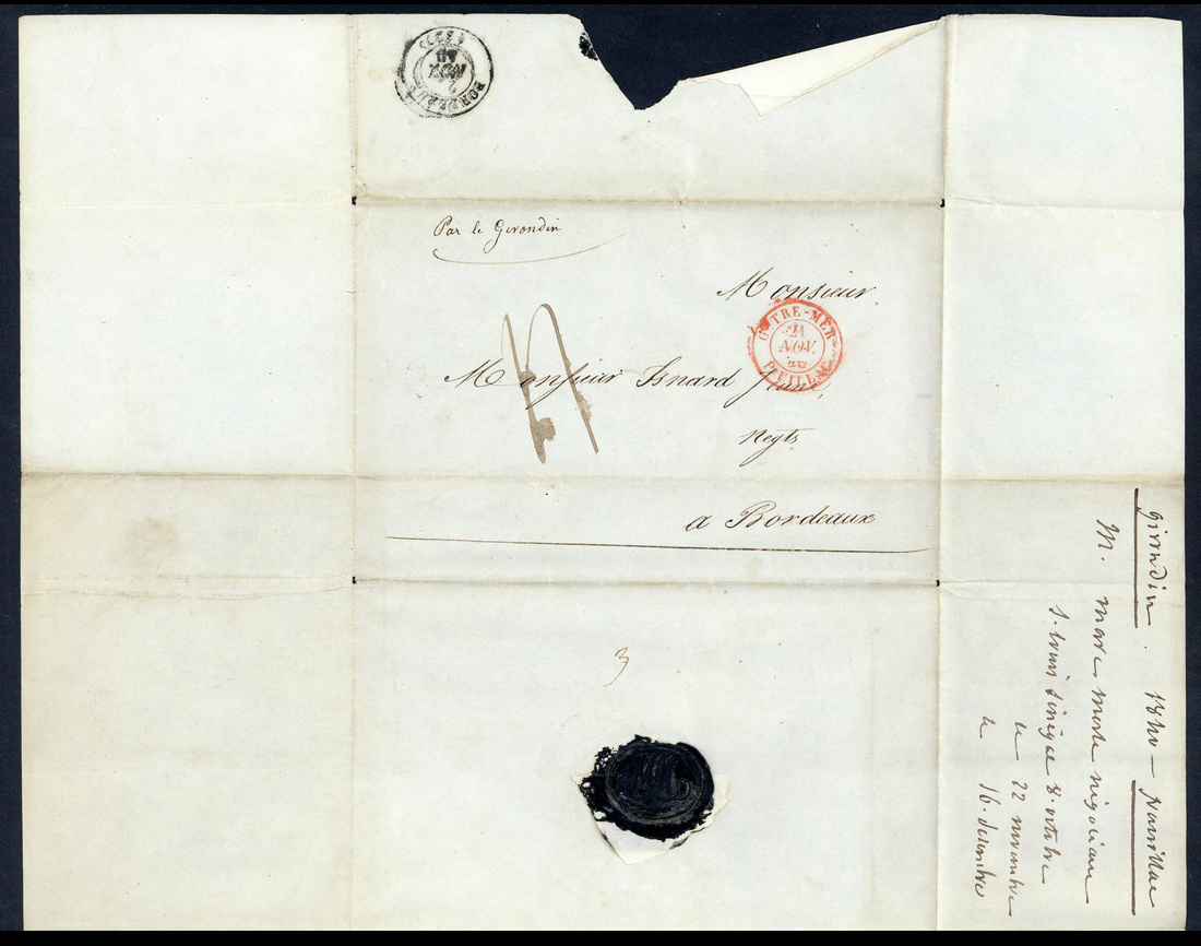 1840 (8 Oct.), 1842 (12 Sept.), 1843 (10 June) and 1848 (4 May) entire letters from St. Louis to Bordeaux, the first and third showing "outre-mer/pauillac" (21.11 and 26.8), the second showing "outre-mer/marseille" (2.11) and the last showing "outre-mer/brest" (11.6) datestamps in red. A good group of covers