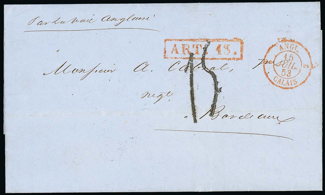 1853 (12 June) entire letter from St. Louis to Bordeaux, showing framed "art. 13." in red (Fig 3007) partly overstruck by handstruck "15", Calais entry d.s. (15.7) and, on reverse, Paris and arrival datestamps. Scarce. Photo