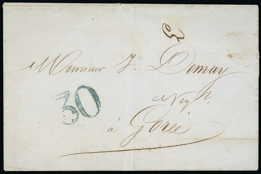 c.1854 entire from St. Louis to Gorée showing handstruck "30" in blue. Scarce internal mail. Photo