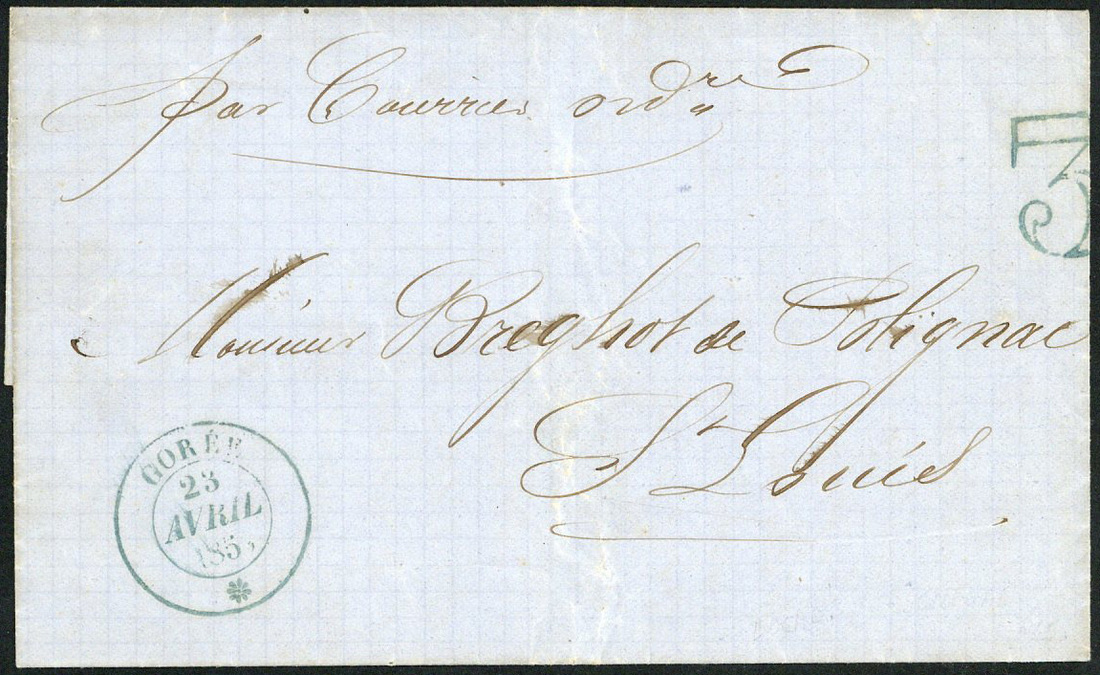 1858 (23 Apr.) entire from Gorée to St. Louis, showing despatch double-ring d.s. with handstruck "3(0)" in blue
