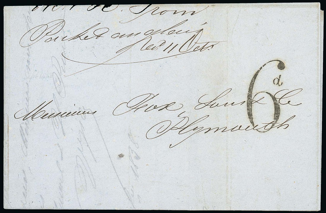 1858 (23 Sept.) entire letter from Gorée to Plymouth, marked "Packet anglais", showing handstruck "6d" and, on reverse, two fine strikes of "plymouth/packet letter" c.d.s. (11.10) in blue. Photo