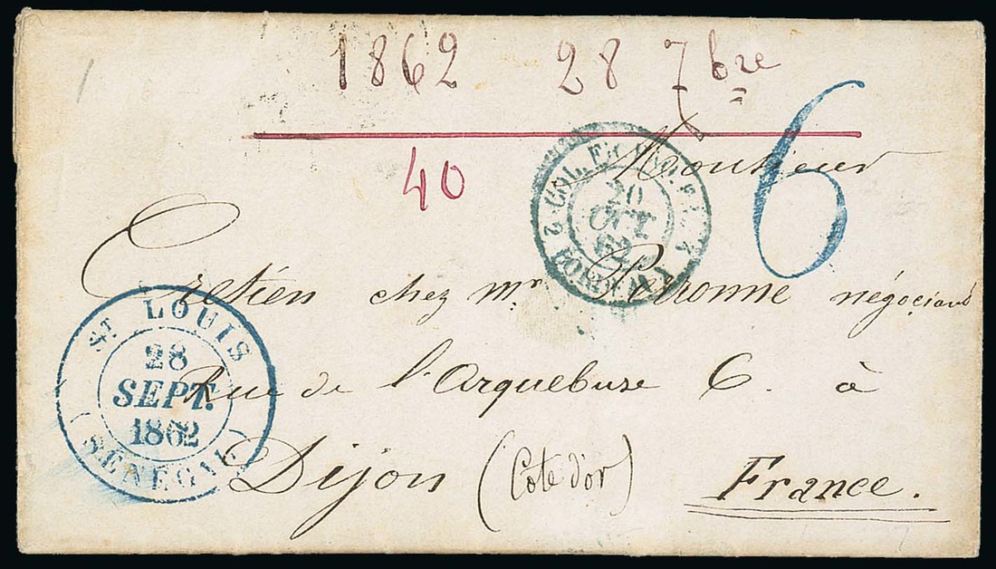 1862 (23 Sept.) entire letter from Bakel to Dijon, showing "st louis/(senegal)" c.d.s. (28.9), "col. fr. paq. fr./2 bordeaux 2" c.d.s. (20.10) and handstruck "6", all in blue. Photo