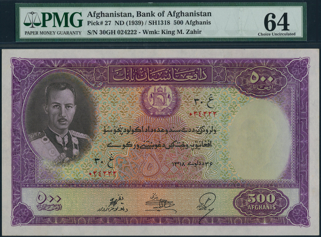 (x) Da Afghanistan Bank, 500 afghanis, 1318 (1939), serial number 024222, purple on multicolour underprint, King Muhammad Zahir at top left, value at each corner, reverse Blue Mosque in Mazari Sharif at centre, values at each corner