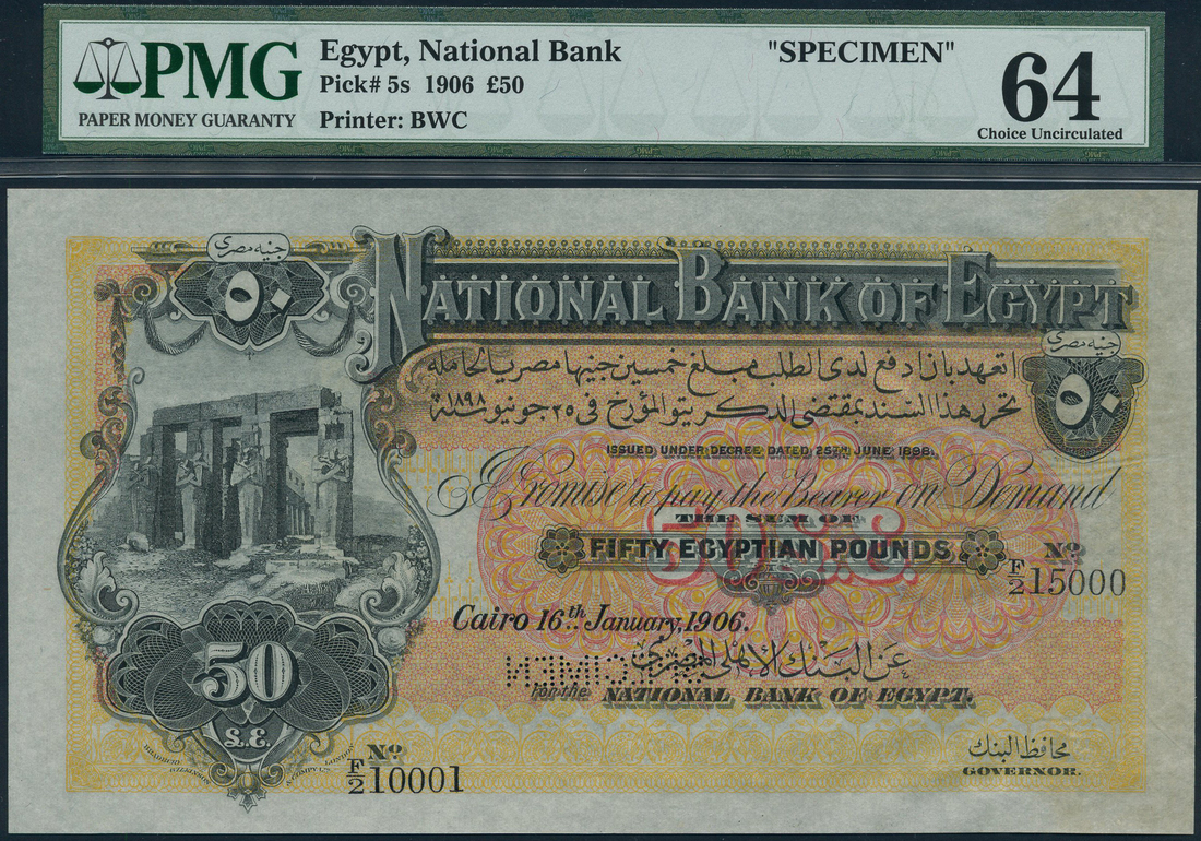 (x) National Bank of Egypt, printers archival specimen £50, 16 January 1906, serial number F/2 10001-F/2 15000, black, pale orange and pale red, the temple at Philae at left, value right centre and at left and right, reverse blue, values at centre, perforated SPECIMEN