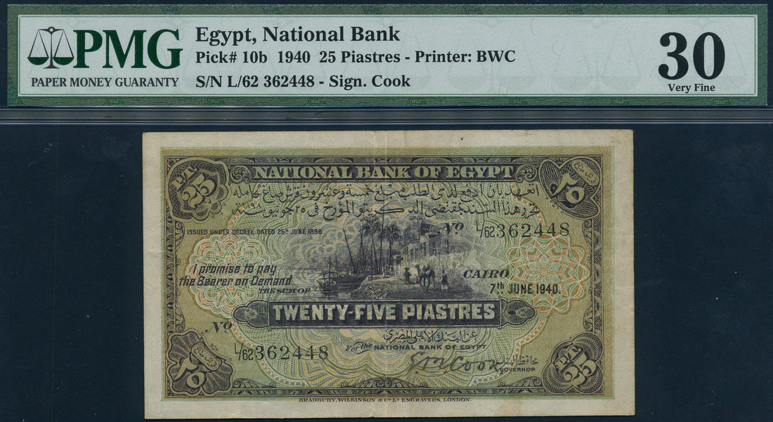 (x) National Bank of Egypt, 25 piastres, 7 June 1940, serial number L/62 362448, brown on multicolour underprint, Nile waterfront scene with boats and camel at centre, value at centre and each corner, reverse blue on orange and light blue underprint, Cook signature