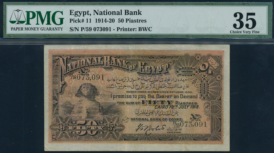 (x) National Bank of Egypt, 50 piastres, 19 July 1918, serial number P/59 073,091, brown on multicolour underprint, Sphinx at left, reverse blue on multicolour, value at centre, left and right