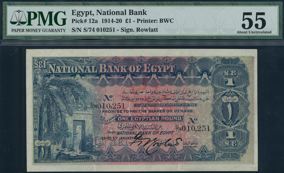 (x) National Bank of Egypt, £1, 5 January 1920, serial number S/74 010,251, blue on red and green underprint, ruins of Karnak at left, value at right and each corner, reverse green, values, Rowlatt signature