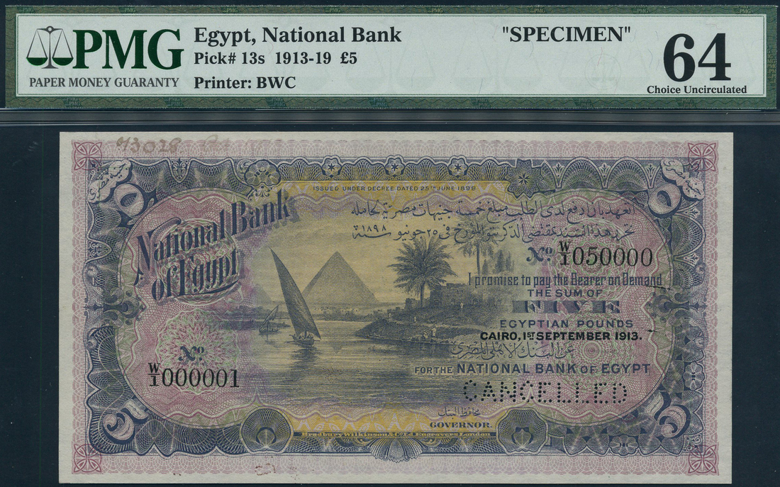 (x) National Bank of Egypt, printers archival specimen £5, 1 September 1913, serial number range W/1 000001 to W1 050000, lilac, yellow and pale green underprint, feluccas on the Nile, pyramids in background, value in each corner, reverse lilac and pale orange and green, value at left and right set in ornate guilloches, perforated CANCELLED