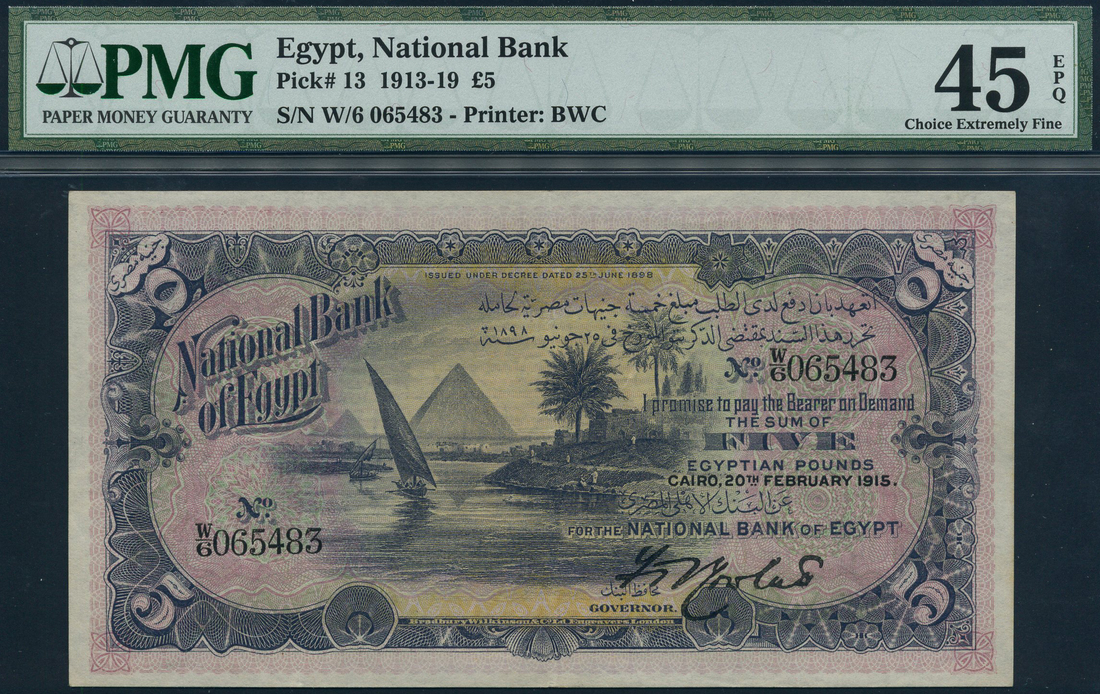(x) National Bank of Egypt, £5, 20 February 1915, serial number W/6 065483, lilac, yellow and pale green underprint, feluccas on the Nile, pyramids in background, value in each corner, reverse lilac and pale orange and green, value at left and right set in ornate guilloches