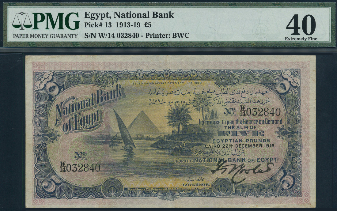 (x) National Bank of Egypt, £5, 22 December 1916, serial number W/14 032840, lilac, yellow and pale green underprint, feluccas on the Nile, pyramids in background, value in each corner, reverse lilac and pale orange and green, value at left and right set in ornate guilloches