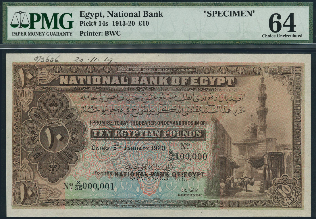 (x) National Bank of Egypt, printers archival specimen £10, 15 January 1920, serial number X/35 000,001-X/35 100,000, brown and multicoloured, Old Cairo street scene and the Mosque of Qayetbay at right, value at left, reverse brown, value at left and right, perforated CANCELLED