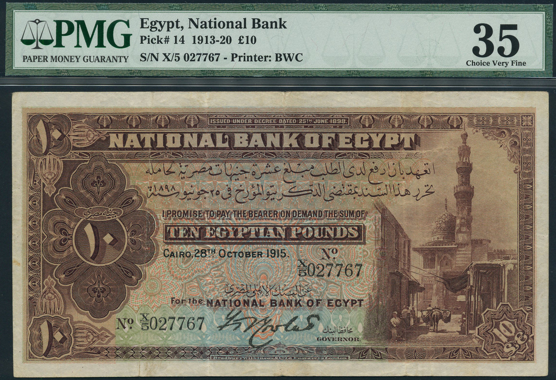 (x) National Bank of Egypt, £10, 28 October 1915, serial number X/5 027767, brown and multicoloured, Old Cairo street scene and the Mosque of Qayetbay at right, value at left, reverse brown, value at left and right