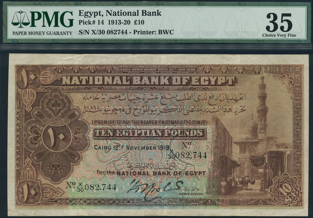 (x) National Bank of Egypt, £10, 12 November 1919, serial number X/30 082,744, brown and multicoloured, Old Cairo street scene and the Mosque of Qayetbay at right, value at left, reverse brown, value at left and right