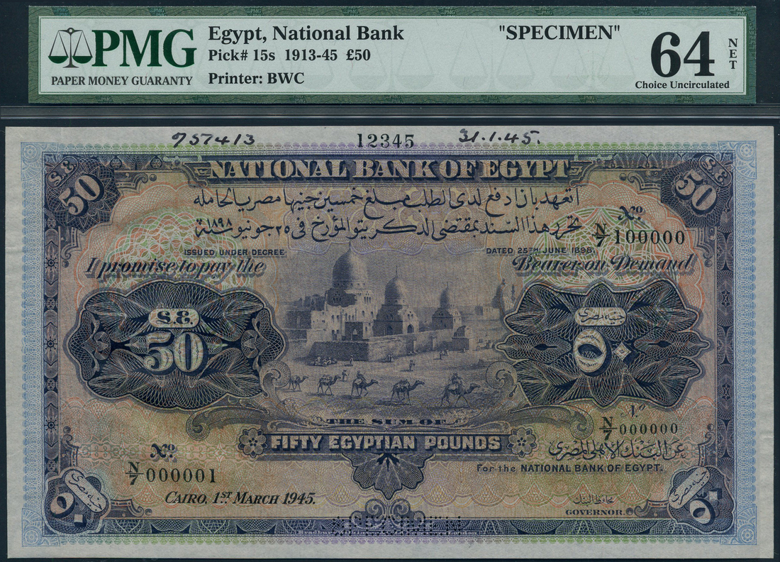 (x) National Bank of Egypt, printers archival specimen £50, 1 March 1945, serial number N/7 000001-N/7 100000, purple on multicolour underprint, Mameluke tombs and camel caravan at centre, value at left and right and each corner, reverse purple, value at corners, perforated SPECIMEN