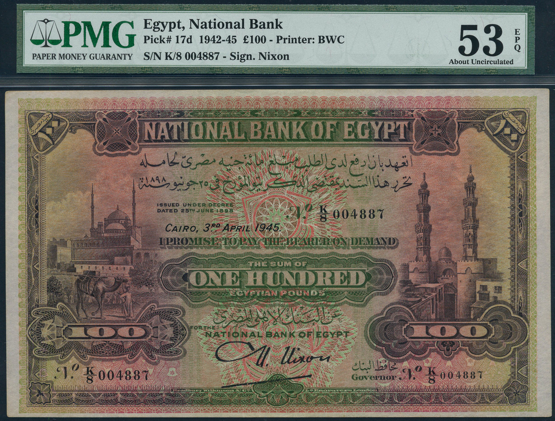 (x) National Bank of Egypt, £100, 3 April 1945, serial number K/8 004887, green and purple on multicolour underprint, Citadel of Cairo at left, Mosque with two minarets at right, vale at each corner, reverse multicoloured, Island of Philae with sailing boat at centre, value at top left and right, Nixon signature