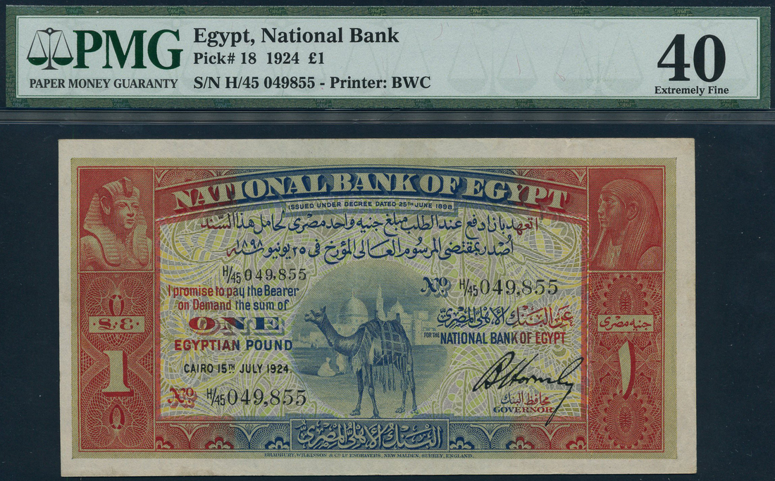 (x) National Bank of Egypt, £1, 15 July 1924, serial number H/45 049,855, red-orange and blue on multicolour underprint, Camel at centre, heads of Pharaohs at top left and right, value at low left and right