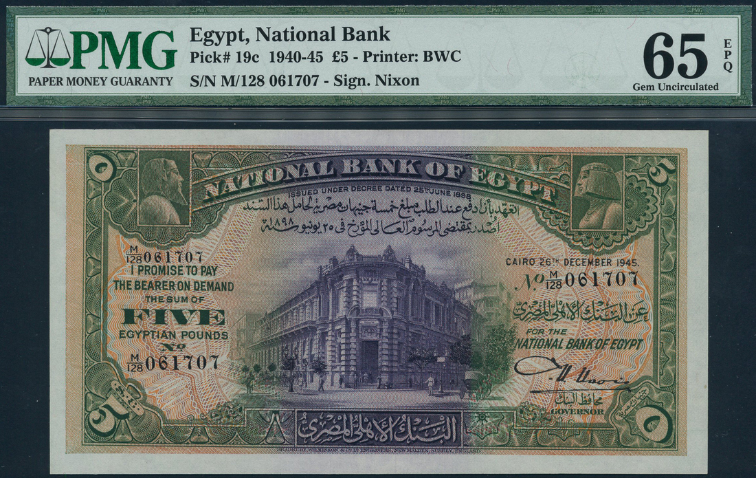 (x) National Bank of Egypt, £5, 26 December 1945, serial number M/128 091707, green and purple on multicolour underprint, bank building at centre, value at each corner, reverse blue and red, palms and domed building at centre, Nixon signature
