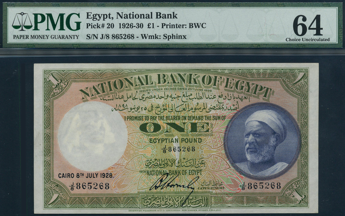 (x) National Bank of Egypt, £1, 8 July 1928, serial number J/8 865268, green and purple on multicolour underprint, Fellah at right, value at centre and each corner, reverse purple, the Mosque of al-Mansour Seif el-Dein Qa'la Un at centre
