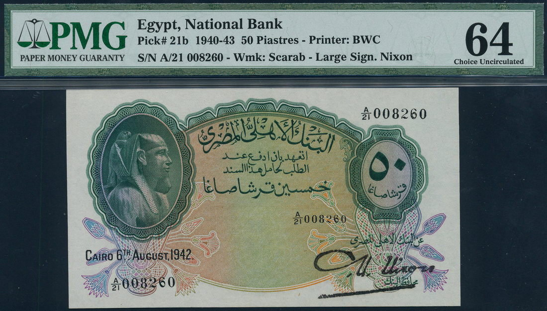 (x) National Bank of Egypt, 50 piastres, 6 August 1942, serial number A/21 008260, green on multicolour underprint, Tutankhamen at left, value at right, reverse blue, arms at left, large Nixon signature